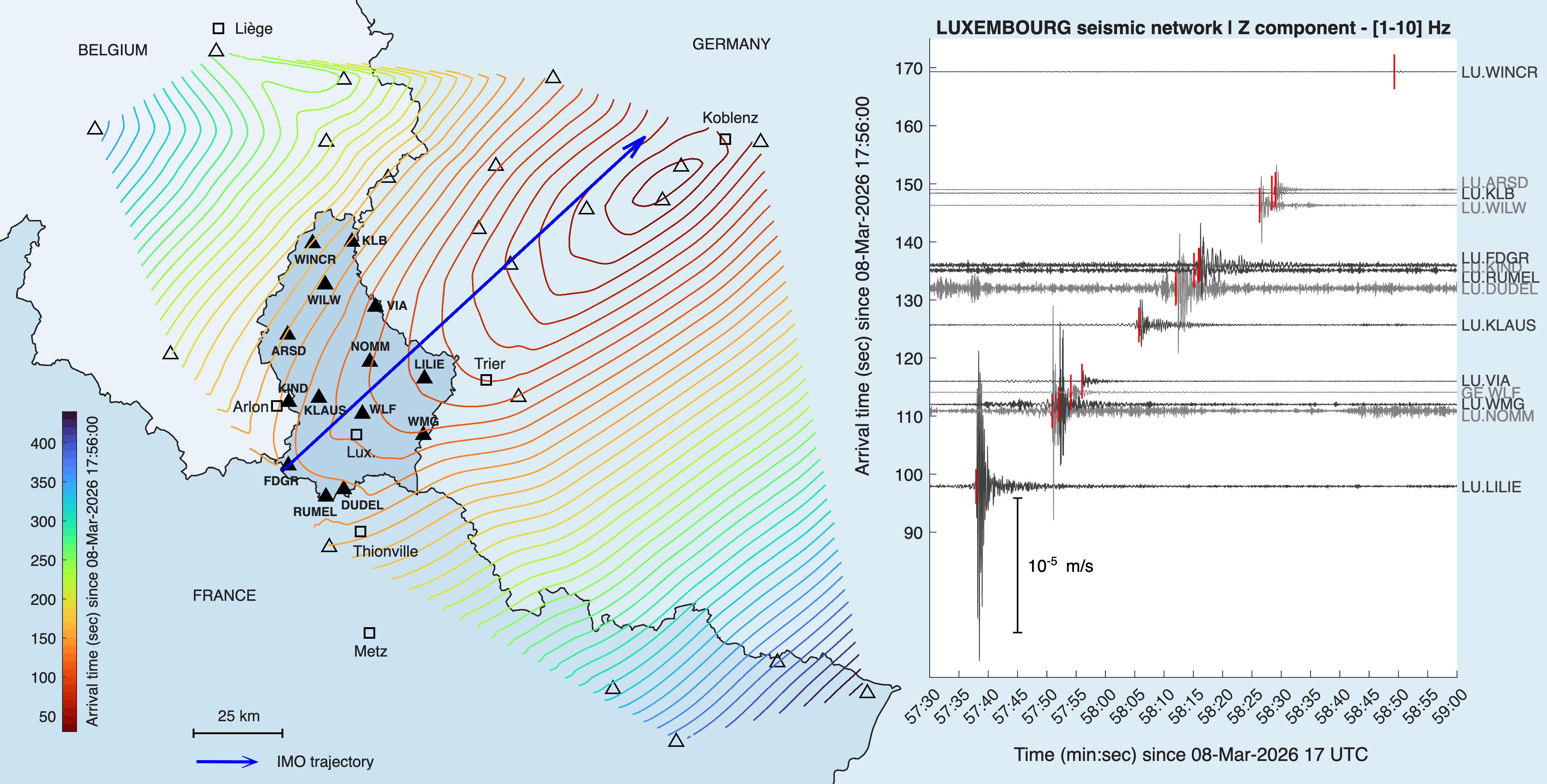 The figure shows the signal arrival times of the meteor burst at 34 seismic stations in Luxembourg and surroundings. The colored contour lines indicate the arrival times (30 to 440 sec) from 17:56 UTC on 8 March 2026. Filled triangles represent stations of the Luxembourg National Seismic Network (LuxSNet), open triangles are stations operated by partner institutions. The inset shows the seismic traces (vertical component) of the fireball signal over the LuxSNet stations. Red lines in the inset indicate the picked arrival times.
